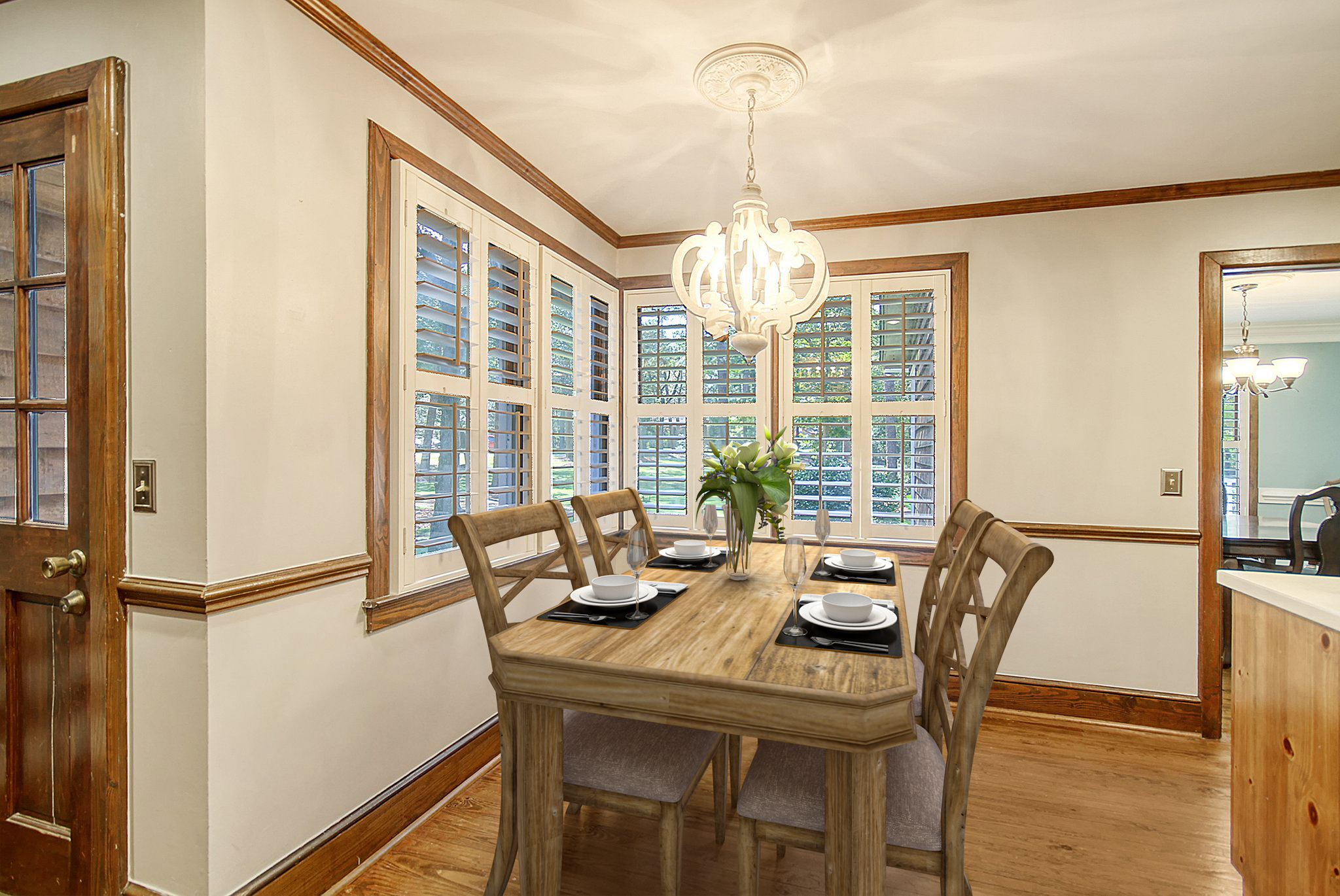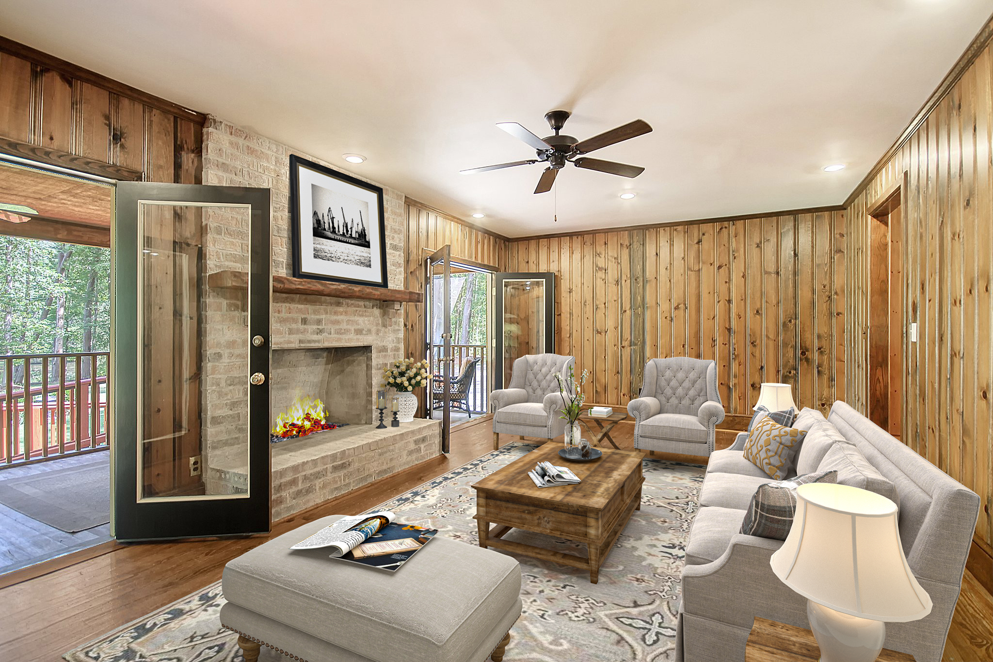 Rustic Elegance: As you step inside, you'll be captivated by the gorgeous hardwood oak flooring that flows throughout the main living spaces. The plantation shutters and custom crown Moulding creates that southern feel to the home. The knobby pine paneling exudes warmth and character creating a cozy ambiance that invites you to unwind and a view of the pond.