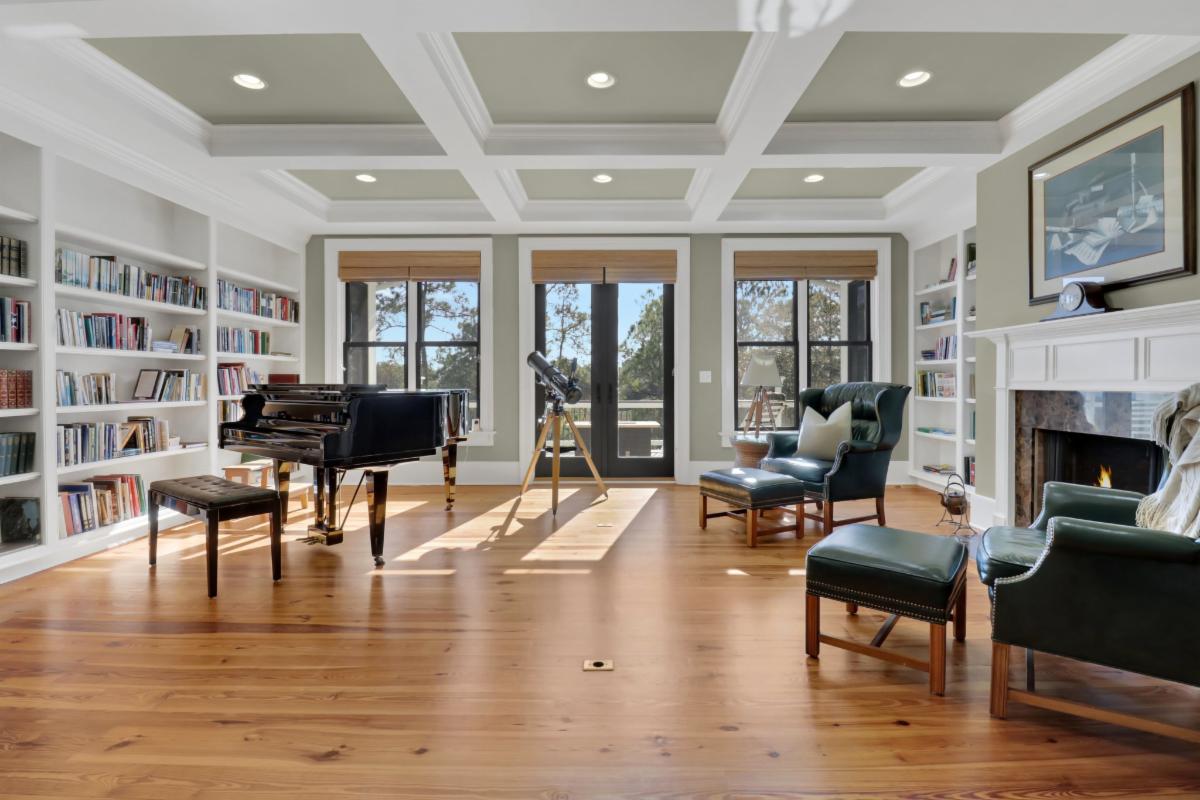 Bonus room/library on the second level boasts w/ coffered ceiling, floor to ceiling bookcases, French doors and a fireplace