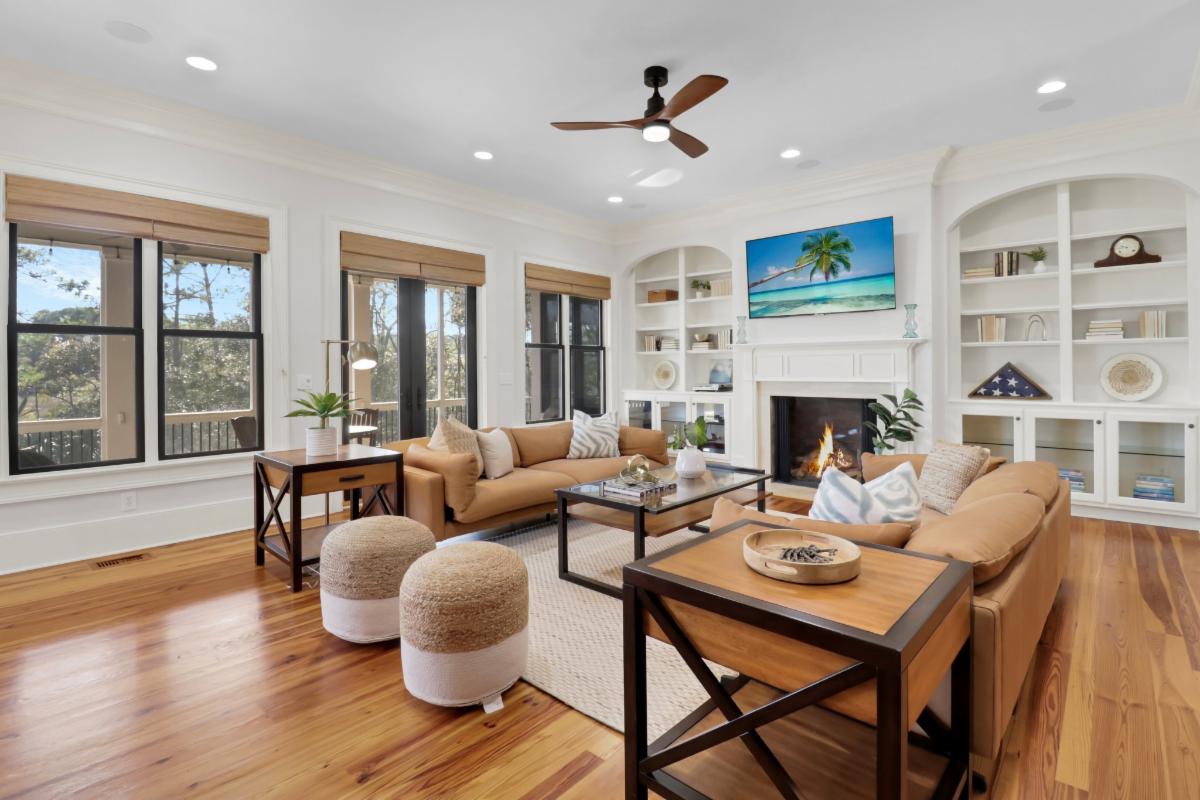 Living room with fireplace, bookshelves & glass cabinets