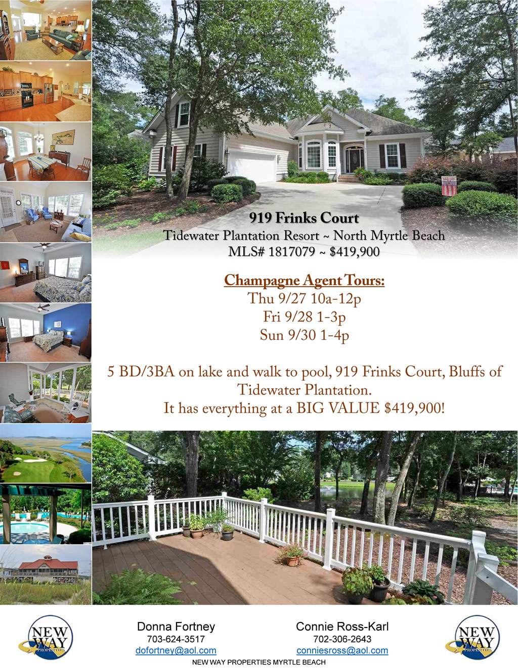 Agent Tours Invited this week: 9/27 morning, 9/28 afternoon and Open House Sunday 9/30 afternoon -- 4 - 5 BD/3BA on lake and walk to pool, 919 Frinks Court, Bluffs of Tidewater Plantation. It has everything at a BIG VALUE $419,900!